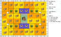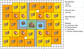 Creating Production layouts in the Orient is tricky because fields cannot be cultivated on Desert soil. The Small noria can turn the Desert fertile, but the radius is often too small to build entire layouts with just a single Small noria. The Large noria has a large enough radius that the previously discussed base layouts can be used, but this is only unlocked at 1040 Envoys, which is simply too late into the game. To still use the previously discussed layouts would require building multiple Small norias with overlapping Influence areas to reach every field. However, when a field is covered by multiple Norias, the productivity of that field can actually exceed 100%, meaning we might need less fields to still reach 100% overall productivity. This is referred to as the Noria exploit (though some argue it is an intended mechanic). The following layouts all use two Small norias, and have at least half of the standard required number of fields. This will be referred to as a minor Noria exploit.