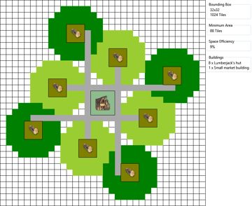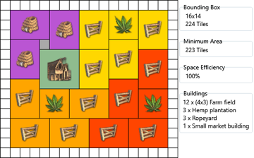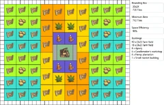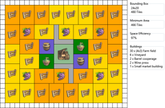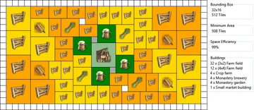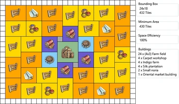 The only limiting factor in a Continuous game to the growth of your empire is the space you have available. Therefore, it is generally a good idea to use efficient layouts that optimally make use of the space on your islands. Still, it is often not the most efficient to only use square layouts, and learning when to use which layout is an art. This page contains a collection of layouts for Farm buildings and Production buildings that serve as a baseline for how these buildings can be placed. Layouts have loosely been sorted by progression and the number of Norias used. Layouts for Oriental Goods without Norias are designed to be used with Large norias.